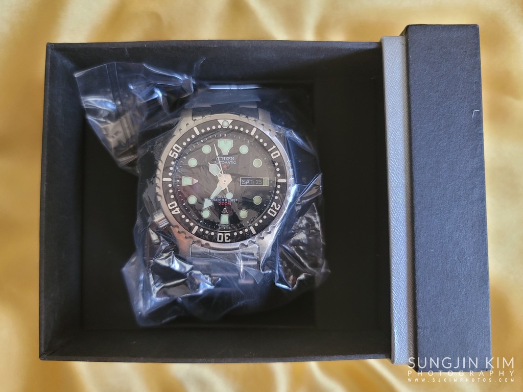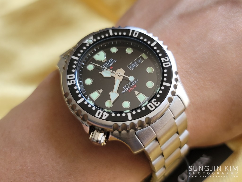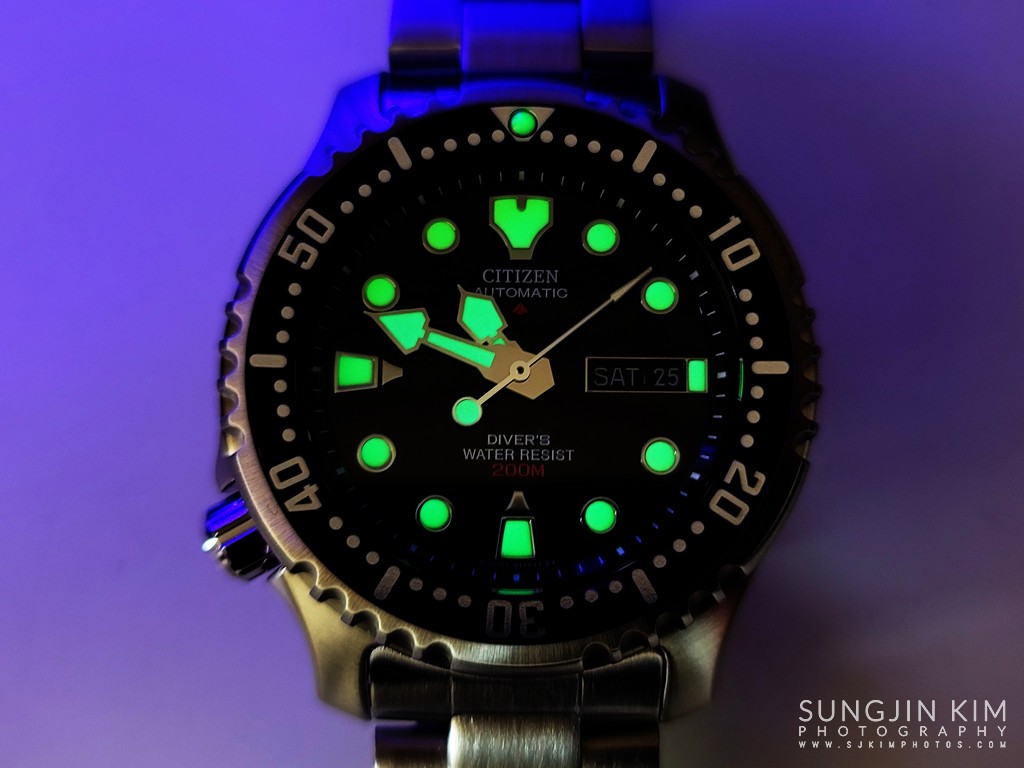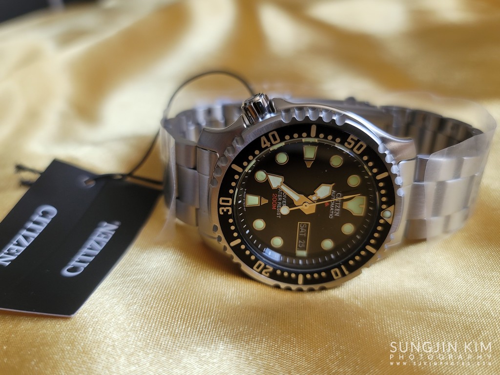 CITIZEN 브랜드와 "AUTOMATIC"은 12시 위치에 흰색으로 인쇄되어 있고 "DIVER'S WATER RESIST"는 6시 위치에 인쇄 되어 있다. 또한 다이얼에는 시티즌 로고와 200m가 빨간색으로 인쇄 되어 있다.