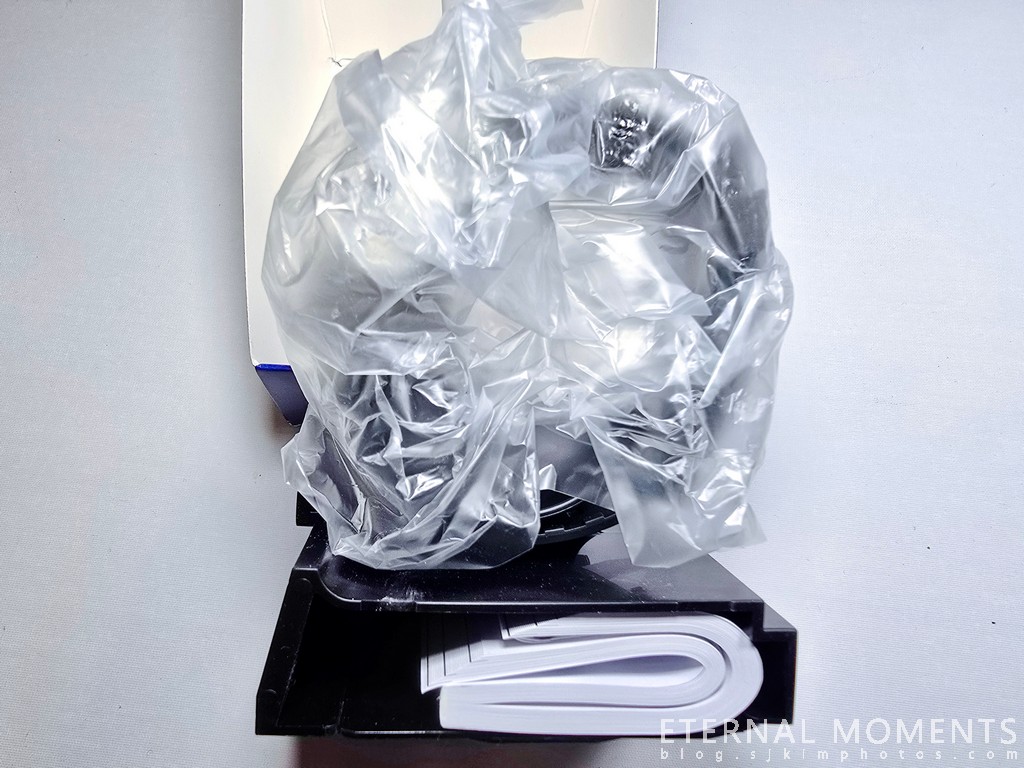 내부 박스에는 시계를 고정하는 검은색 플라스틱 스탠드가 들어있으며, 시계는 투명 비닐에 싸여 안전하게 보관되어 있습니다. 시계 스탠드 하단에는 접힌 설명서가 수납되어 있습니다.