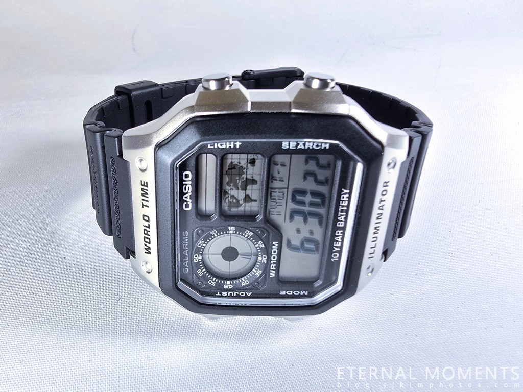 각인: 케이스와 디스플레이 주변에 'WORLD TIME', '5 ALARMS', 'CASIO', 'LIGHT', 'SEARCH', 'ADJUST', 'MODE', 'WR100M', '10 YEAR BATTERY', 'ILLUMINATOR' 등 주요 기능과 브랜드 명이 명확하게 각인되어 있습니다.