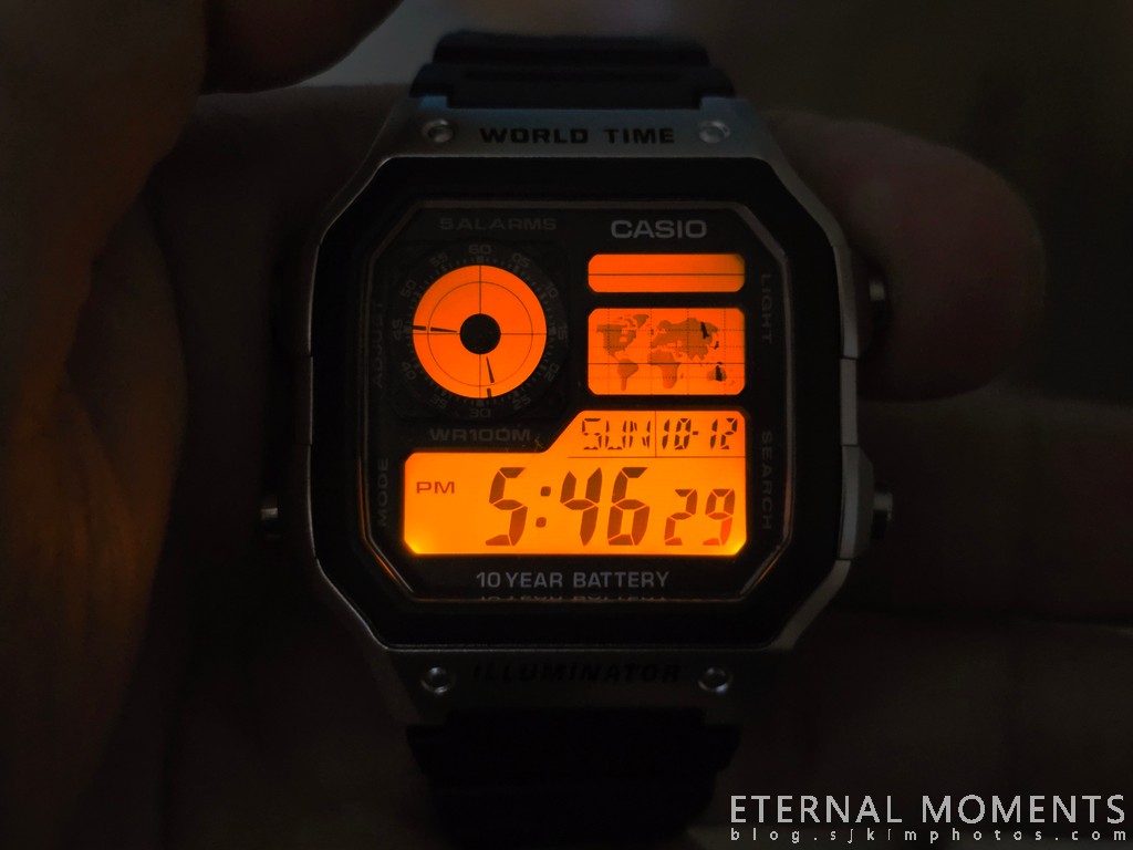 시계 하단에 'ILLUMINATOR'가 각인되어 있으며, 사진 19에서 어두운 곳에서 주황색 백라이트가 켜지는 모습을 확인할 수 있습니다. 어두운 환경에서도 시간을 확인하기 편리합니다.